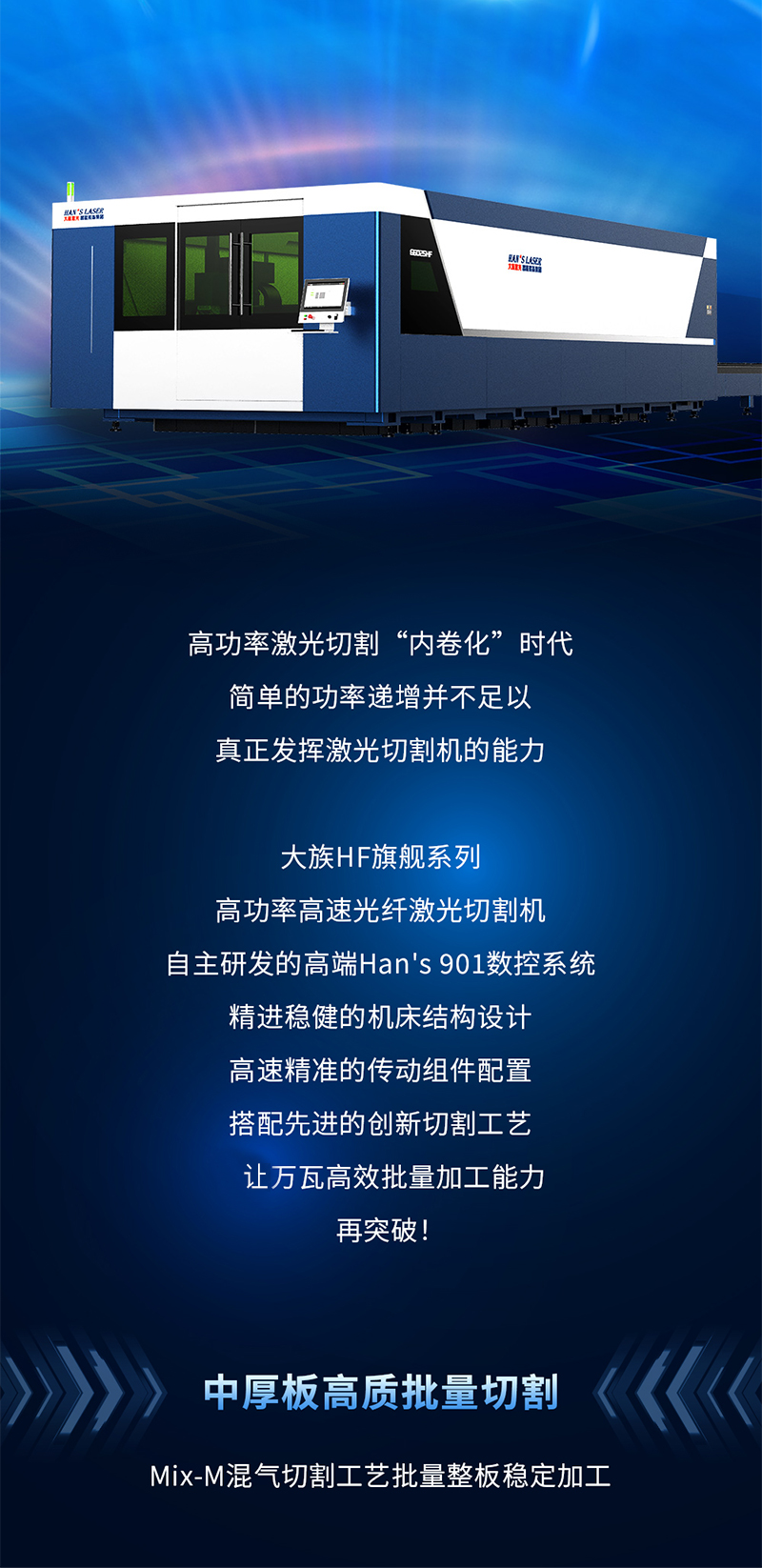 HF系列光纖激光切割機(jī)最大程度地發(fā)揮數(shù)千瓦乃至上萬瓦光纖激光器的切割速度,為您提供最高效的薄、中、厚板加工解決方案。